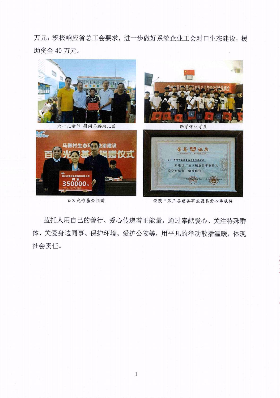 为深入贯彻落实习近平总书记在中央人大工作会议上重要讲话精神和全国人大常委会贯彻落实意见要求,8月9日,常州市武进区人大常委会副主任戴志华、洛阳镇人大主席吴小铭一行莅临常州市蓝托金属制品有限公司举行武进区“人大代表联系点”(洛阳镇)授牌仪式,公司总经理梅祖南、运营总经理卢继平、总经理助理曹建忠全程陪同。